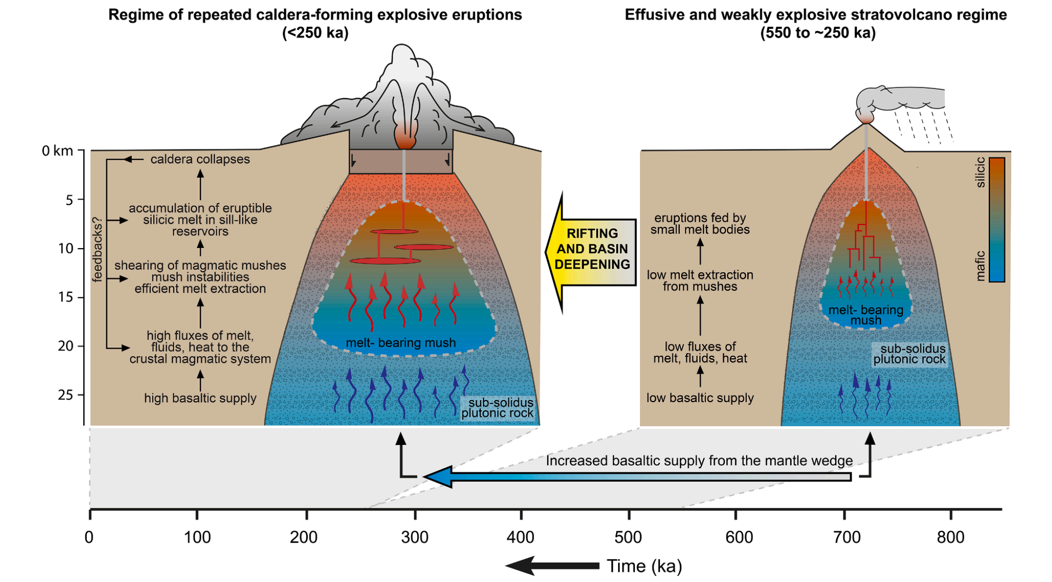 Σχήμα 1: Σχηματικό μοντέλο διαμόρφωσης της ηφαιστειακής δραστηριότητας στη σύγχρονη Σαντορίνη από τη φάση επιταχυνόμενης ρηγμάτωσης που έλαβε χώρα πριν από περίπου 300-250 χιλιάδες έτη.