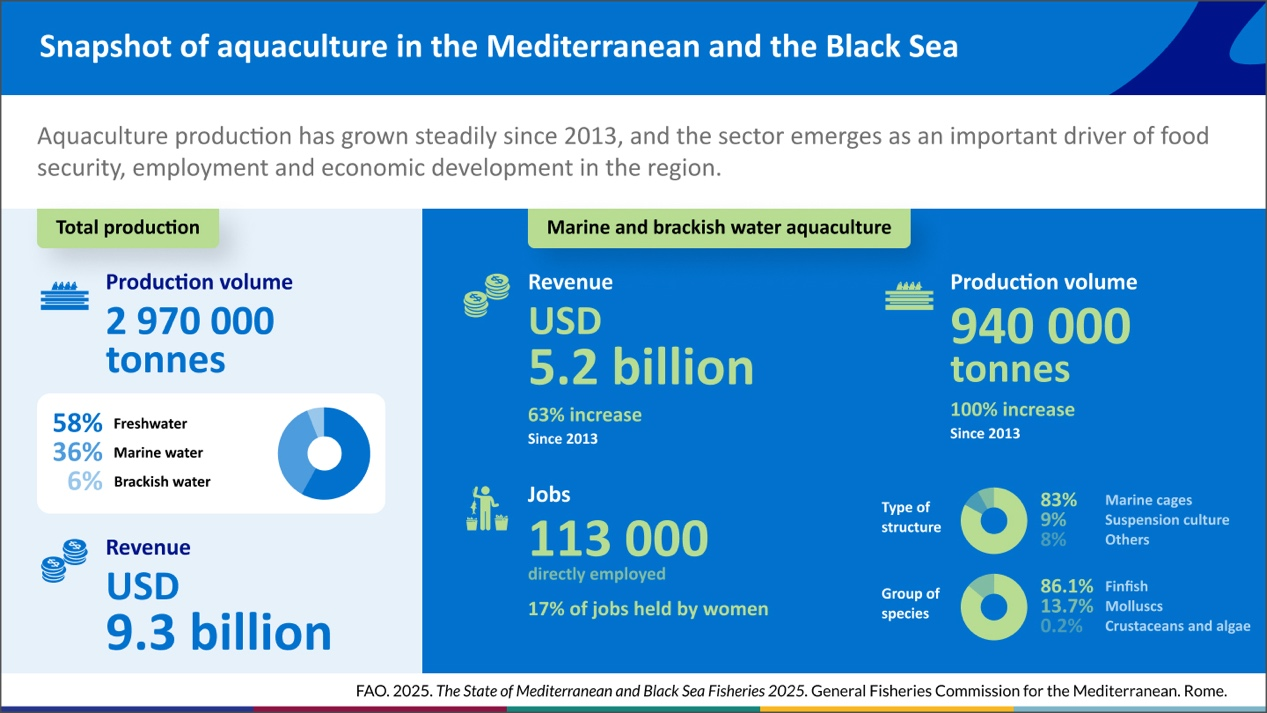 On November 28, 2025, at the headquarters of the Food and Agriculture Organization (FAO) in Rome, the General Fisheries Commission for the Mediterranean (GFCM) presented its report on The State of Mediterranean and Black Sea Fisheries – 2025. The report shows that the sustainability of fisheries in the Mediterranean and Black Sea remains a source of concern, but the percentage of stocks that have been overfished is the lowest in the last decade, a milestone that coincides with the rapid growth of aquaculture as a major source of aquatic food in the region.